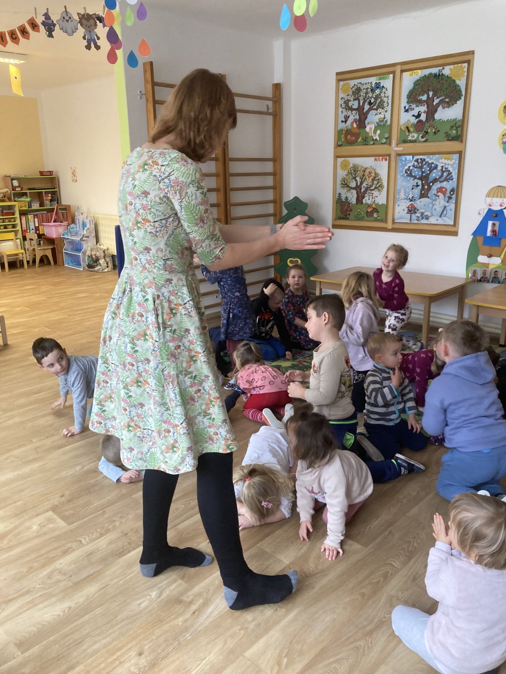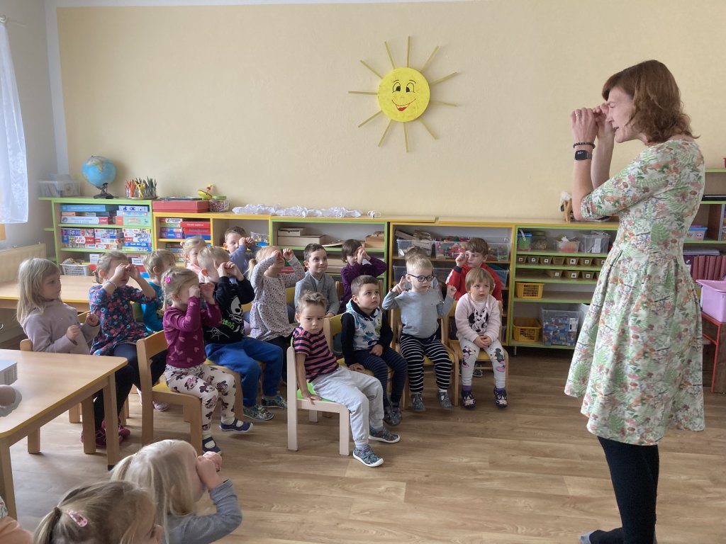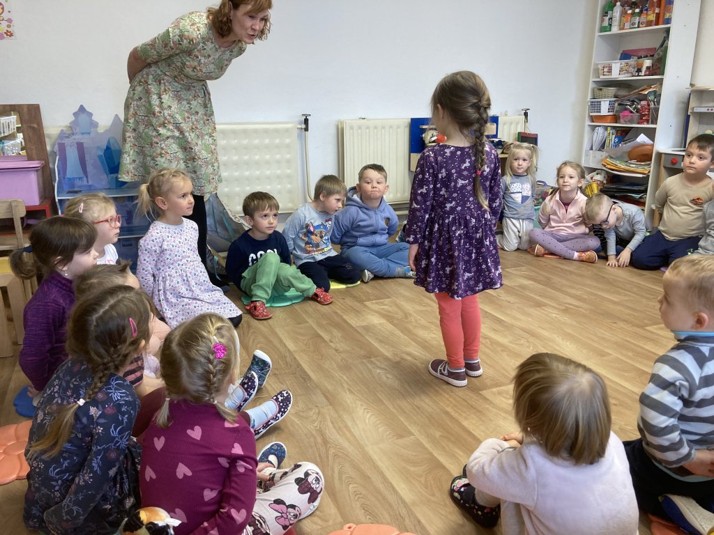 jako myšky kolem spícího jezevce a nesměly ho probudit) a hru „Slyšíš, slyšíš pěnkavu?“ (děti seděly v kruhu,