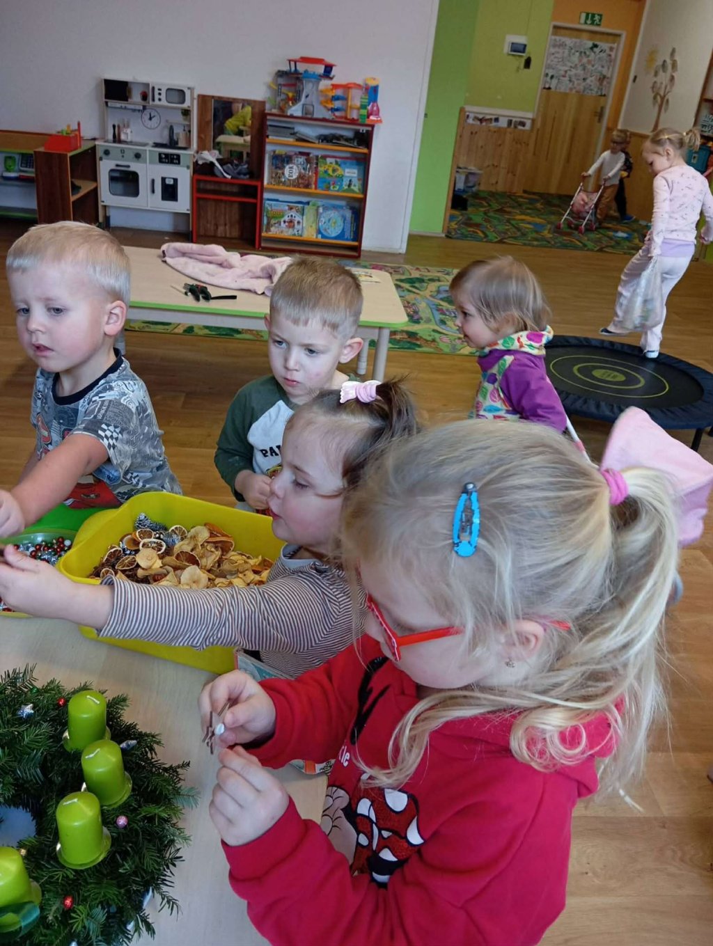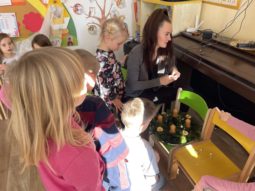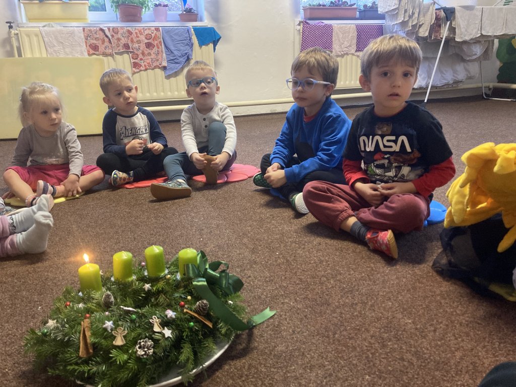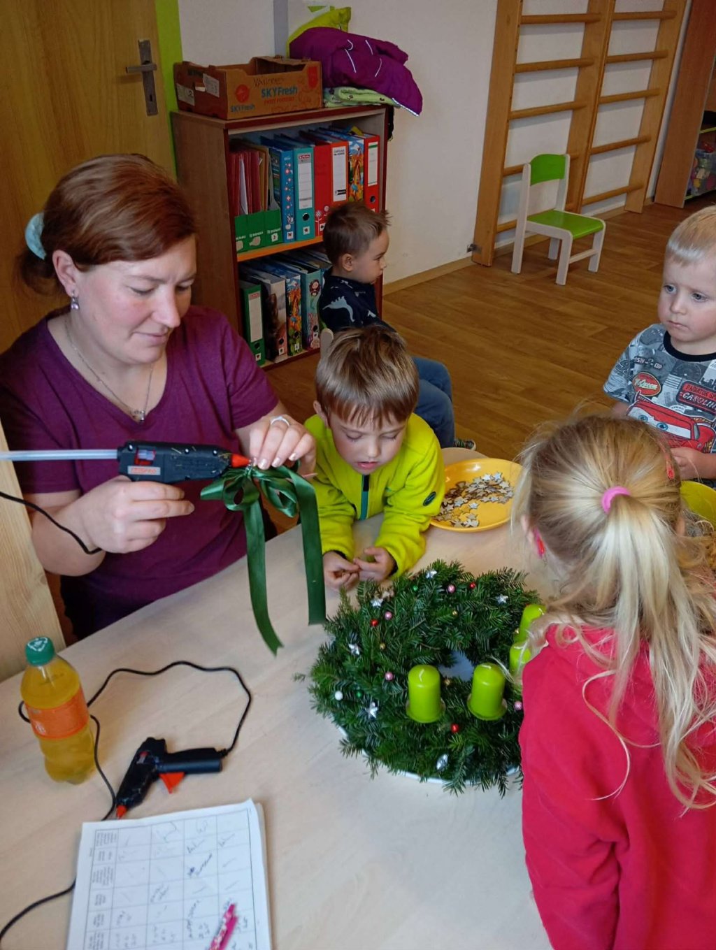 V pátek 28. listopadu si děti povídaly o tom, co advent znamená, proč zapalujeme svíčky na věnci a jak se jednotlivé svíčky nazývají. Paní učitelky Adélka a Barunka mezitím připravily pro každou třídu adventní věneček, který si děti za pomocí p. učitelek nazdobily.