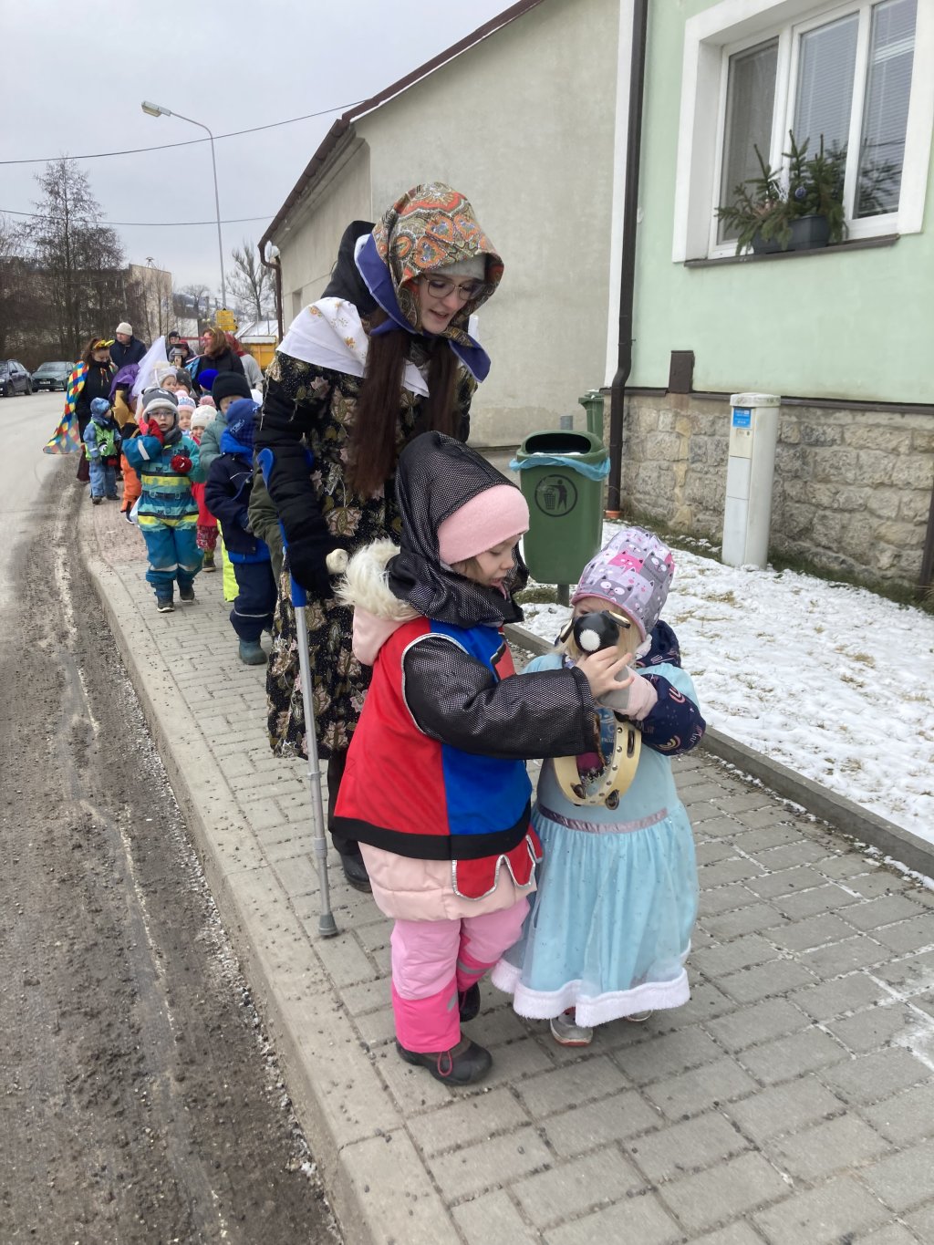 Po muzikoterapii se děti převlékly do kostýmů a vydaly se na veselý průvod obcí, ke kterému se mohli připojit i místní občané. Průvod tak zaplnily pohádkové a veselé postavy, např.: duchové, berušky, Červená karkulka, babička, klauni, šašek, motýl, …