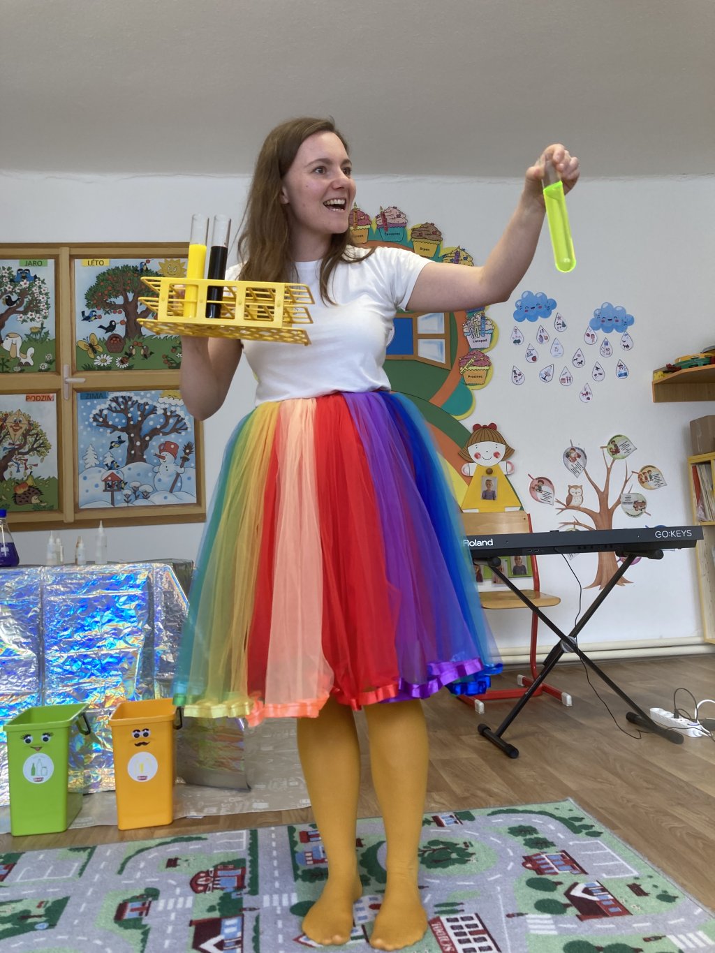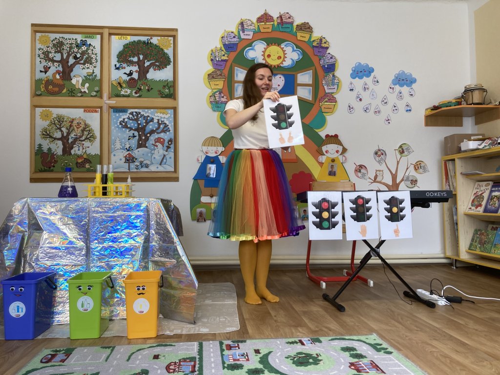 Nejprve se s dětmi přivítala s písničkou Za vědou a seznámila je s tím, co je dneska čeká a že budou dělat pokusy s barvičkami. První pokus spočíval v míchání barev - do kelímků s vodou se dalo barvivo a děti měly 4 barvy (červenou, modrou, žlutou a bílou), z kterých postupně míchaly další barvy (zelenou, fialovou, oranžovou a růžovou). Následně se děti naučily novou písničku o barvičkách s doprovodem hrou na tělo. Poté děti zjistily pokusem, co se stane, když všechny vytvořené barvičky smícháme dohromady a jak postupným přidáváním barev se barva mění, čím začala diskuze, jestli na světě existuje něco, co nemá vůbec žádnou barvu. Díky tomu Vědunka vytáhla tajný neviditelný dopis, který je napsaný průhlednou barvou a společnými silami se jej snažily odtajnit pomocí barvičky ve spreji a náhle uviděli na dopise popelnici. Poté se Vědunka s dětmi snažila vzpomenout, jaké barvičky mají popelnice a na co každá slouží a k tomu si zazpívali písničku s doprovodem hrou na tělo. Následoval další pokus, jak vytvořit díky zásaditosti různé barvičky a zase je nechat zmizet. A na závěr programu si děti zkusily čarování s barvičkami, kdy děti vyčarovaly žlutou, černou a neonově zelenou barvičku. Děti se rozloučily s Vědunkou pomocí písničky s dopravními prostředky s barvami semaforu.